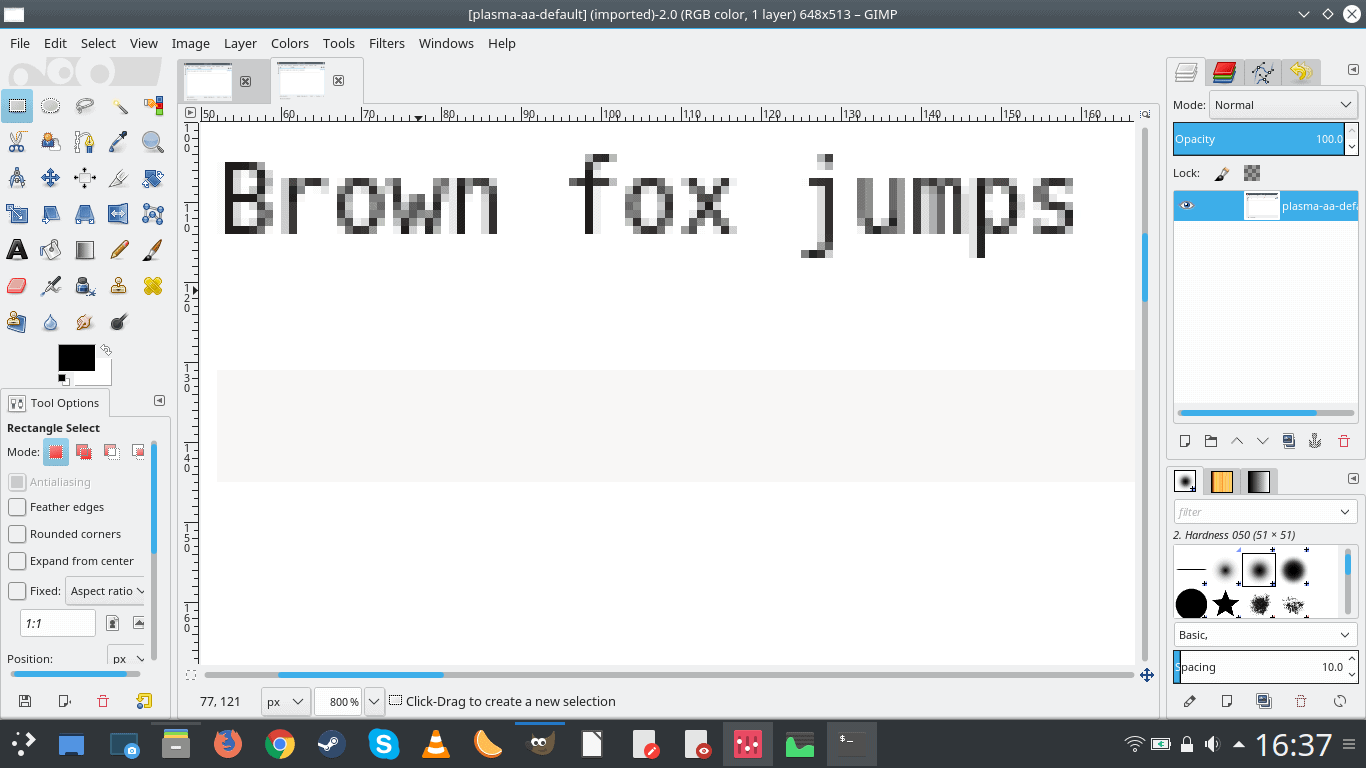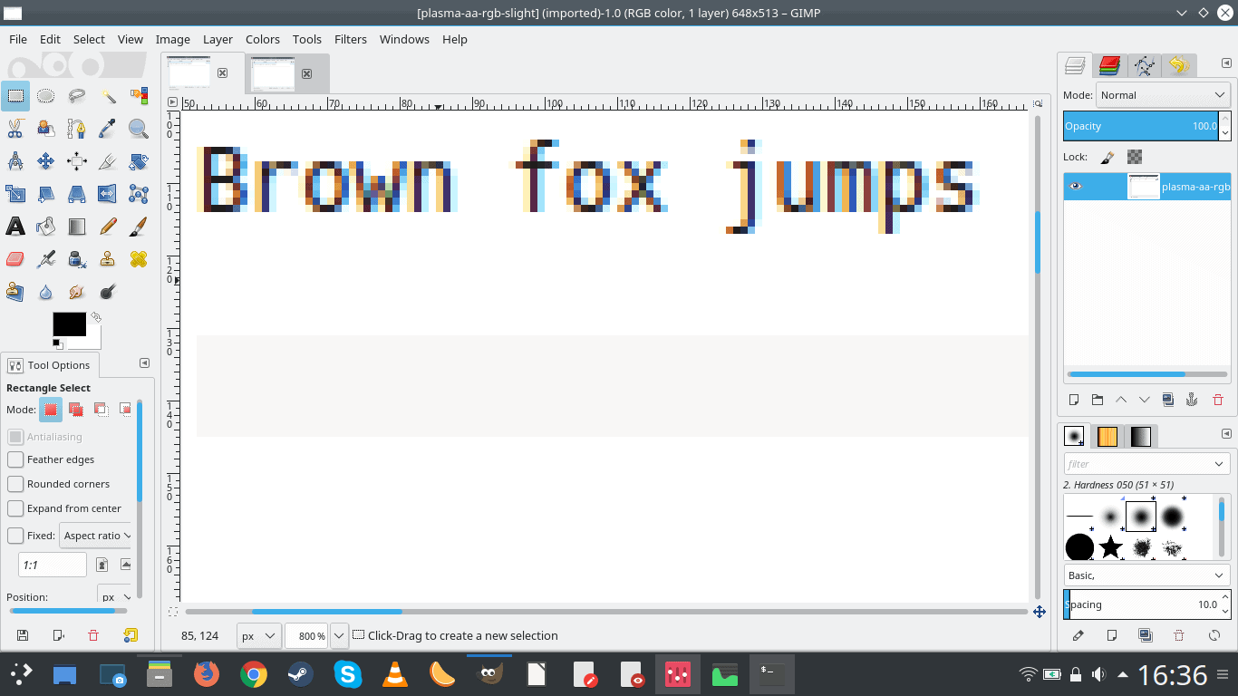 I decided to run a small mathematical test, if you will. I wrote the same sentence in the text editor, twice, once with the default AA settings and once with my own preferred choice (RGB, slight hinting). I then took screenshots of these two documents and blew them up to 800% size in GIMP, to see whether there’s an actual difference. And there is.